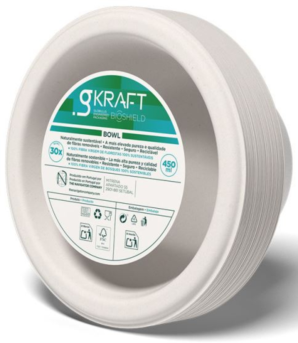 DESCUBRA A SOLUÇÃO PARA EMBALAGENS CUJA MISSÃO É TER IMPACTO POSITIVO NO FUTURO._x000D_ A The Navigator Company eleva o conceito e com isso, a noção de sustentabilidade. Contribuímos para embalagens com significado. Somos uma força verde positiva._x000D_ _x000D_ A gama Bioshield oferece embalagens inovadoras em celulose moldada, uma solução biodegradável e renovável para tableware, takeaway e indústria agroalimentar. _x000D_ Desenvolvidas para garantir a preservação dos alimentos, são a escolha ideal para empresas que procuram reduzir o impacto ambiental sem comprometer a qualidade e a segurança._x000D_ _x000D_ Com gKRAFT, a segurança vem em primeiro lugar_x000D_ Naturalmente sustentável_x000D_ A mais elevada pureza e qualidade de fibras renováveis_x000D_ 100% Fibra virgem de florestas 100% sustentáveis_x000D_ _x000D_ Bowls Bioshield 450ml_x000D_ Resistentes e versáteis, são ideais para refeições quentes ou frias._x000D_ Cor Branco_x000D_ Biodegradável_x000D_ Reciclável_x000D_ Apto Micro-ondas