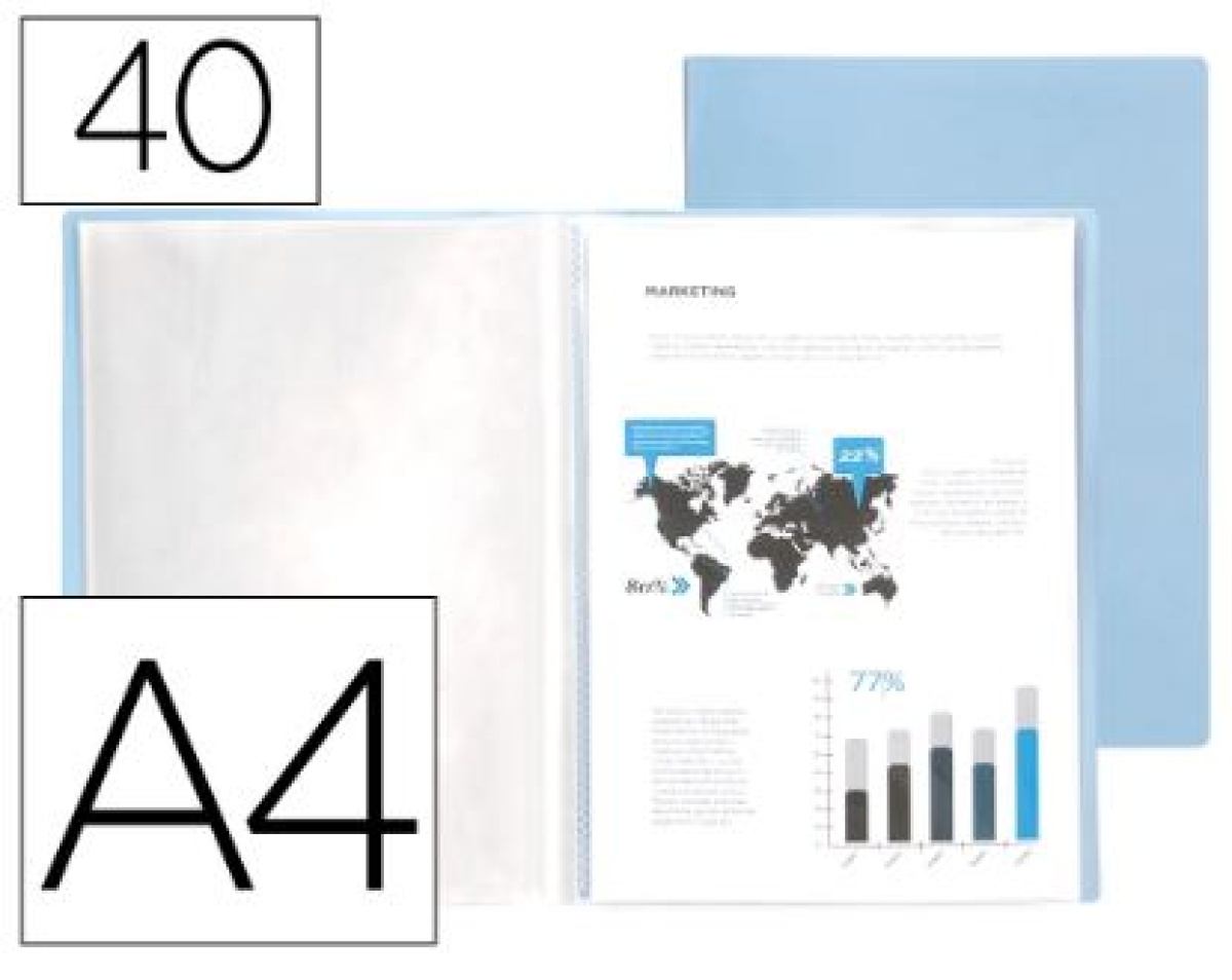 Fabricada em polipropileno de elevada durabilidade, esta pasta com 40 compartimentos é a solução perfeita para manter os seus documentos organizados e protegidos. O seu formato DIN A4 e o acabamento opaco em azul claro tornam-no funcional e atrativo para qualquer ambiente de trabalho ou estudo. Material Resistente: Fabricado em polipropileno que garante uma longa vida útil e proteção contra o uso diário. Design Profissional: Acabamento azul claro opaco que facilita a identificação rápida e proporciona um aspeto atraente. Alta Capacidade: Com 40 compartimentos, permite armazenar até 80 folhas, ideal para guardar documentos e apresentações importantes. Compatibilidade: Perfeito para documentos de tamanho DIN A4 (210 x 297 mm), padrão na maioria dos escritórios e escolas. Utilização versátil: Adequado para apresentações, armazenamento de documentos importantes, projetos escolares e arquivos pessoais. Proteção Eficaz: Capas em polipropileno que protegem contra o pó e a humidade, permitindo uma visualização nítida sem retirar documentos. Organização Eficiente: Facilita a categorização e organização dos documentos com as suas capas individuais. Portátil: Leve e fácil de transportar, ideal para levar para reuniões, entrevistas ou aulas. Economia de espaço: mantém o seu espaço de trabalho arrumado e LIBRE de pilhas de papéis soltos. Em suma, esta pasta é uma opção prática e estética para a organização e proteção de documentos em tamanho DIN A4. O seu design robusto e a sua capacidade adequada fazem dele uma ferramenta essencial para ambientes profissionais e educacionais.