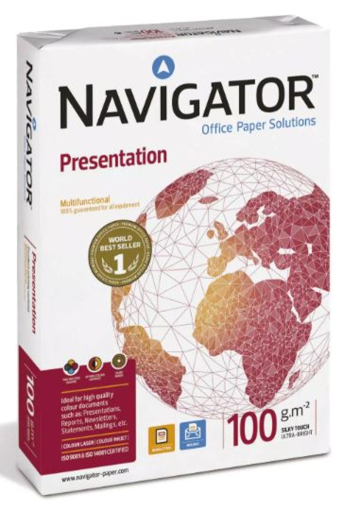 PRESENTATION 100 g.m -2 | Qualidade superior que confere uma melhor aparência ao seu trabalho. Ideal para: apresentações, relatórios, newsletters, declarações, correspondência, etc. ESPESSURA E SUAVIDADE ELEVADAS Leva a uma sensação de qualidade superior, ideal para adicionar valor à sua comunicação. UTILIZAÇÃO EM AMBOS OS LADOS Impressão em duplex e uso intensivo de cor são garantidos sem mostrar a impressão através do papel. MULTIFUNCIONAL Garantido para todas as impressoras de inkjet e laser a cores e fotocopiadoras a cores. TRATAMENTO DE SUPERFÍCIE ESPECIAL Proporciona excelente qualidade de impressão inkjet devido a uma absorção de tinta mais inteligente. TOQUE SUAVE Superfície extra suave. Melhora a vida útil dos equipamentos de escritório, reduzindo o consumo de tinteiro. FÓRMULA UHD A fórmula UHD é um tratamento de superfície especial que mantém o pigmento da cor perto da superfície, garantindo uma definição vívida, de alto contraste e secagem rápida. Impressões de alta-definição em inkjet terão uma aparência mais realista. A4 210x297 mm 500 Folhas/Resma